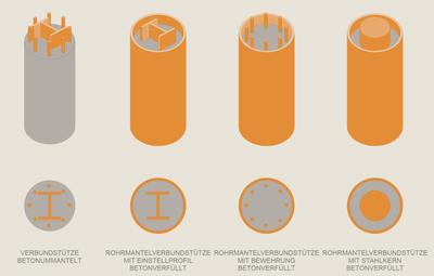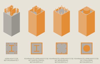 Bei Stahl-Beton-Verbundstützen werden sich die Eigenschaften von Beton und Stahl gemeinsam zu Nutze gemacht.